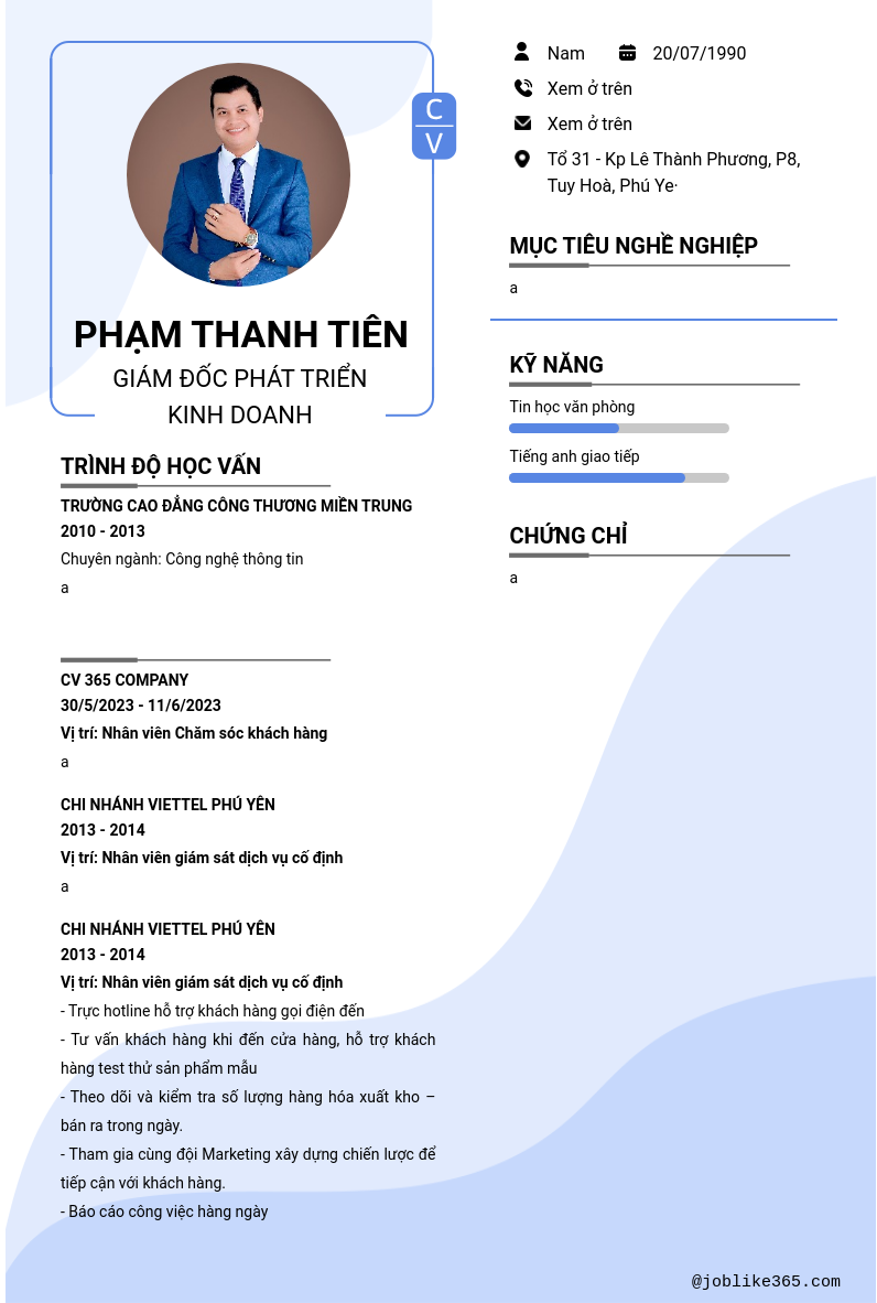 Xem hồ sơ ứng viên PHẠM THANH TIÊN cần 2 điểm. Hồ sơ được cập nhật ngày: 04/08/2024
