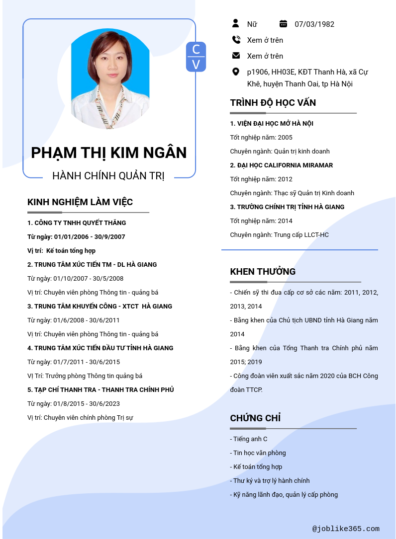 Xem hồ sơ ứng viên PHẠM THỊ KIM NGÂN cần 2 điểm. Hồ sơ được cập nhật ngày: 19/09/2024