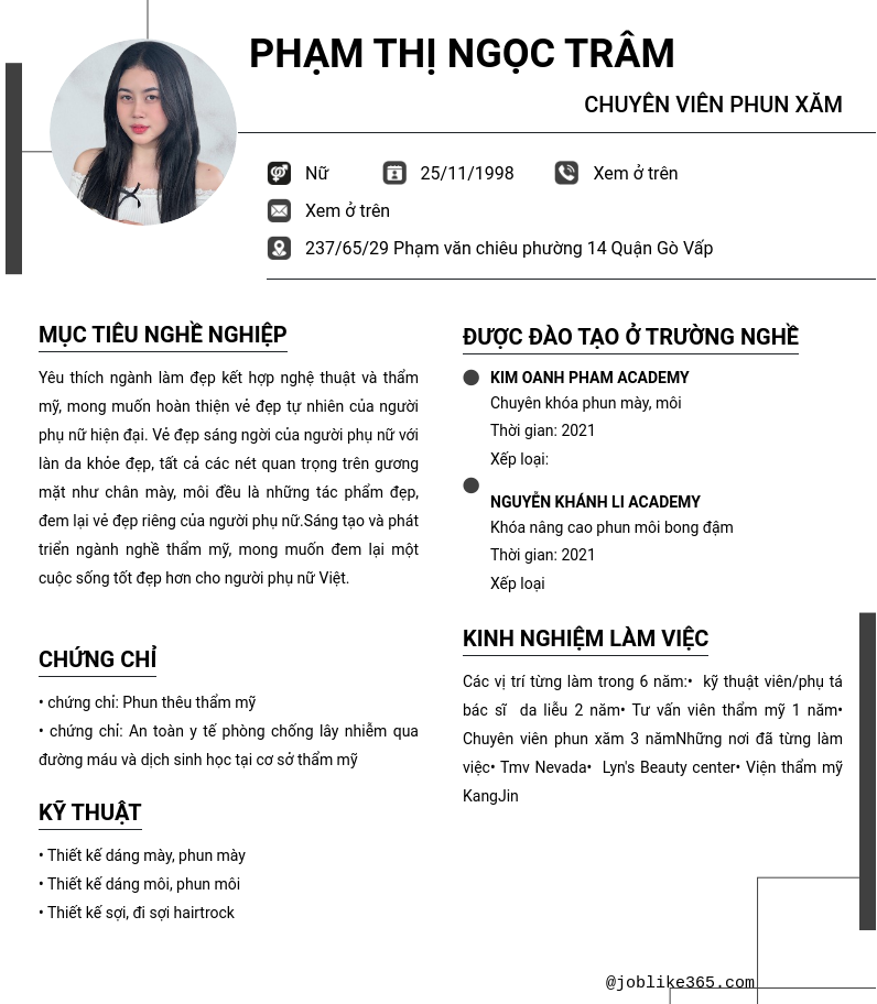 Xem hồ sơ ứng viên Phạm Thị Ngọc Trâm cần 2 điểm. Hồ sơ được cập nhật ngày: 03/12/2024