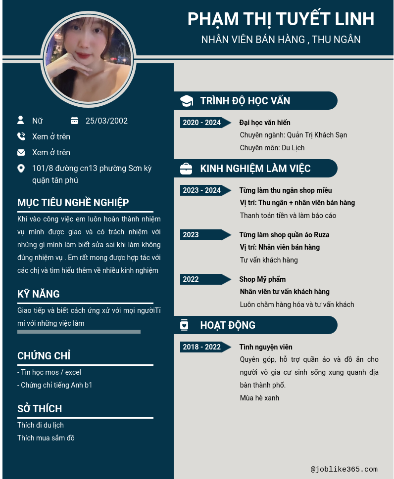 Xem hồ sơ ứng viên Phạm thị tuyết linh cần 2 điểm. Hồ sơ được cập nhật ngày: 01/12/2024
