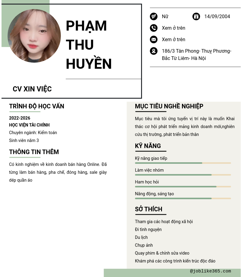 Xem hồ sơ ứng viên Phạm Thu Huyền cần 2 điểm. Hồ sơ được cập nhật ngày: 10/11/2024