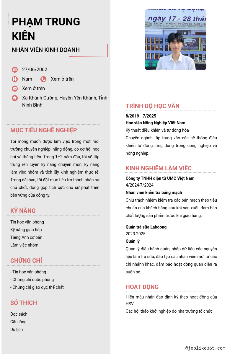 Xem hồ sơ ứng viên Phạm trung Kiên cần 2 điểm. Hồ sơ được cập nhật ngày: 13/08/2025