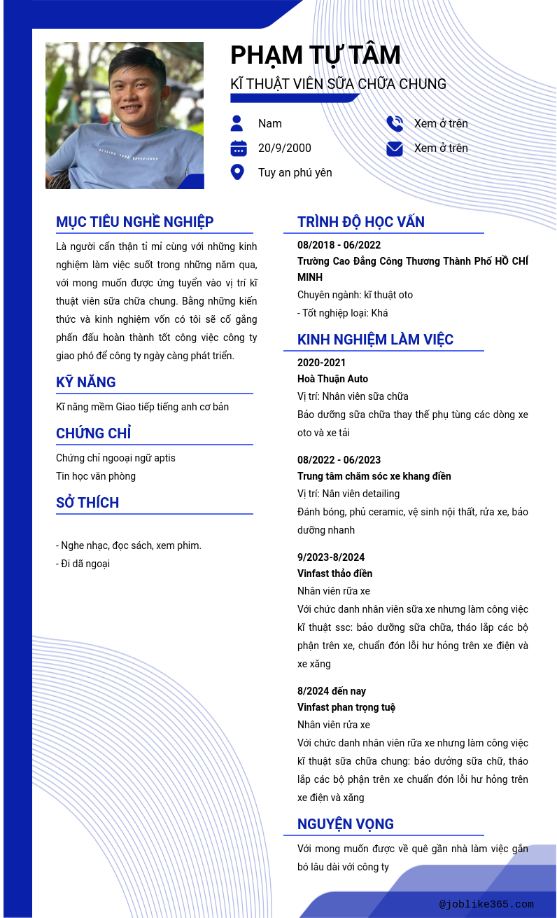 Xem hồ sơ ứng viên PHẠM TỰ TÂM cần 2 điểm. Hồ sơ được cập nhật ngày: 21/11/2024