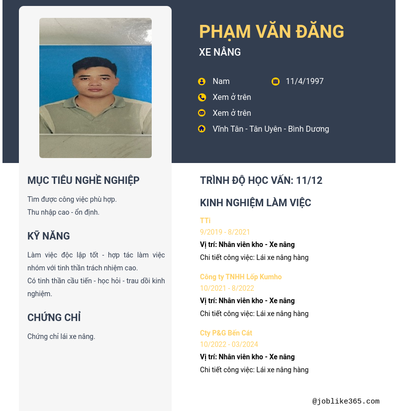 Xem hồ sơ ứng viên Phạm Văn Đăng cần 2 điểm. Hồ sơ được cập nhật ngày: 07/11/2024