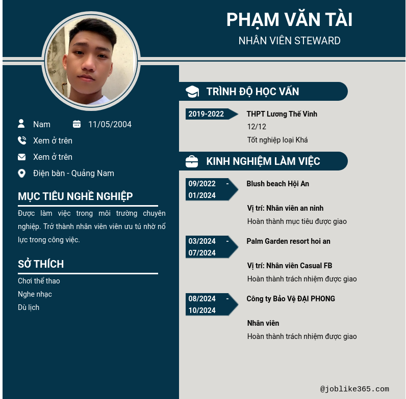 Xem hồ sơ ứng viên Phạm Văn Tài cần 2 điểm. Hồ sơ được cập nhật ngày: 08/11/2024