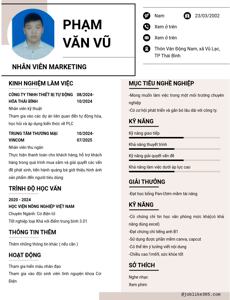 Xem hồ sơ ứng viên Phạm Văn Vũ cần 2 điểm. Hồ sơ được cập nhật ngày: 03/11/2025
