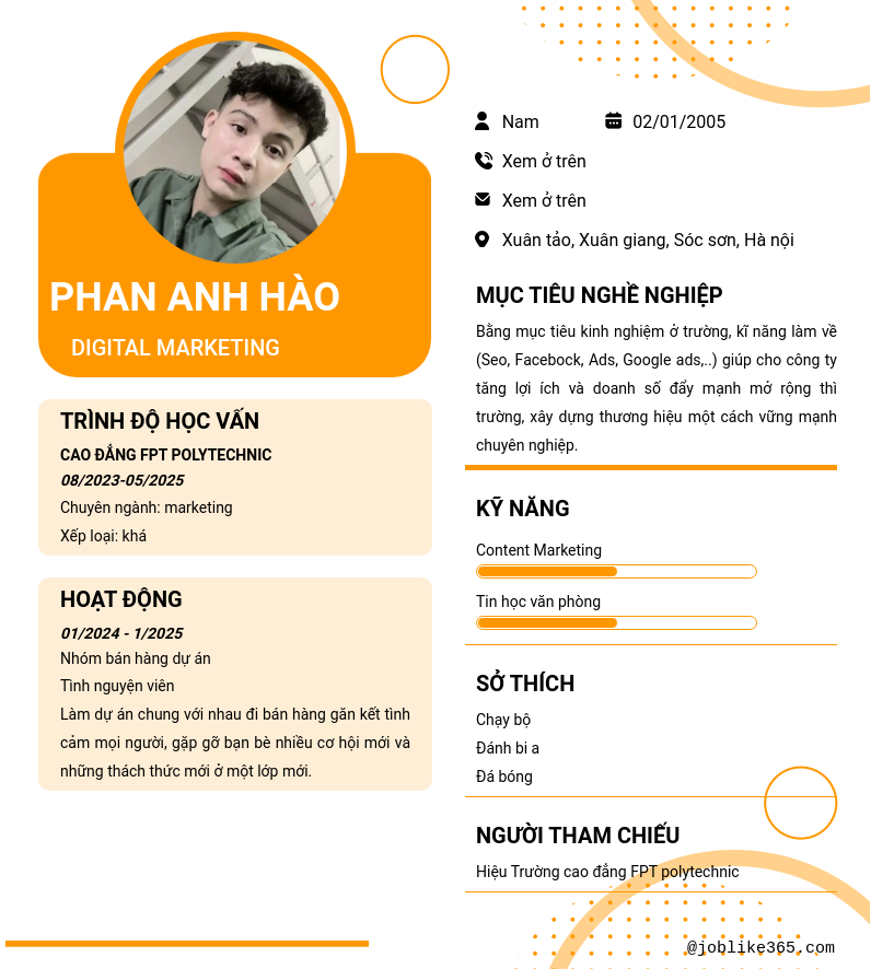 Xem hồ sơ ứng viên Phan Anh Hào cần 2 điểm. Hồ sơ được cập nhật ngày: 16/01/2025