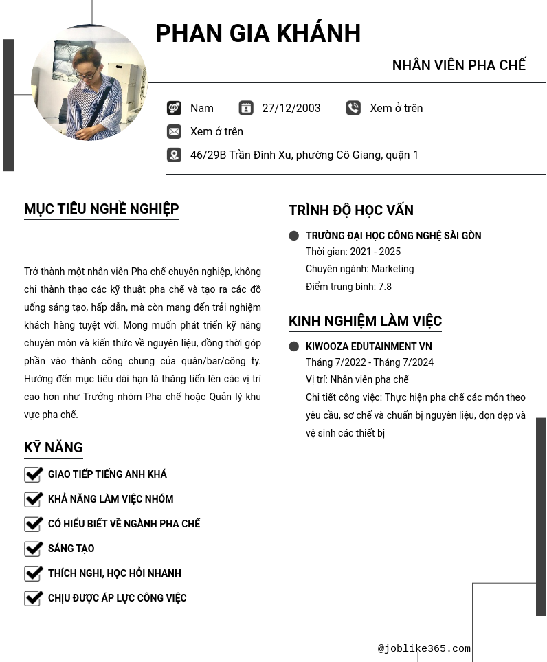 Xem hồ sơ ứng viên Phan Gia Khánh cần 2 điểm. Hồ sơ được cập nhật ngày: 30/10/2024