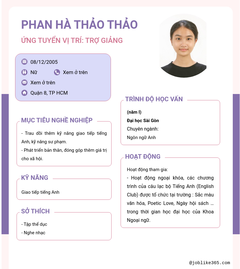 Xem hồ sơ ứng viên PHAN HÀ THẢO THẢO cần 2 điểm. Hồ sơ được cập nhật ngày: 22/07/2024