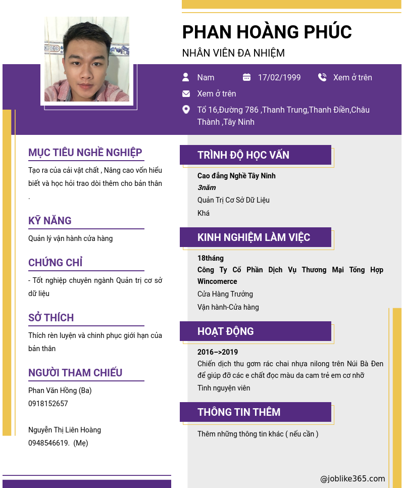 Xem hồ sơ ứng viên PHAN HOÀNG PHÚC cần 2 điểm. Hồ sơ được cập nhật ngày: 21/05/2024