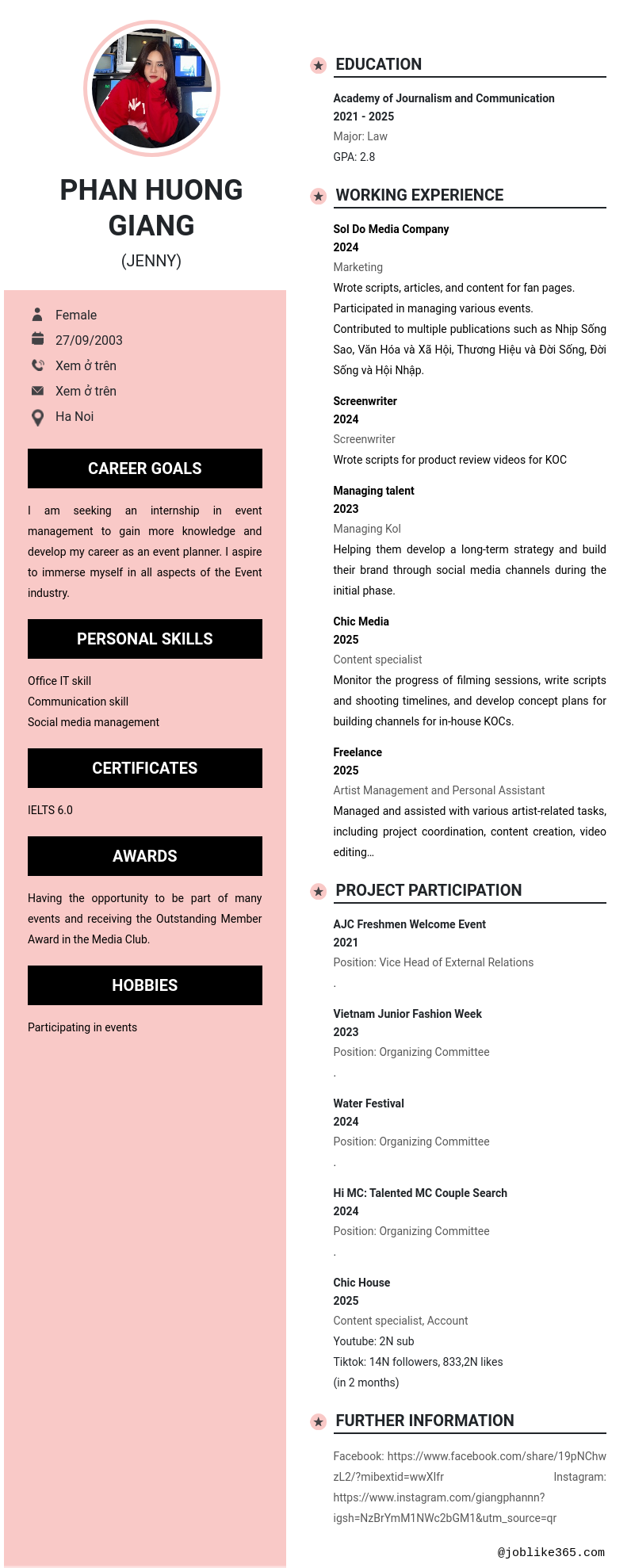 Xem hồ sơ ứng viên Phan huong giang cần 2 điểm. Hồ sơ được cập nhật ngày: 18/10/2025