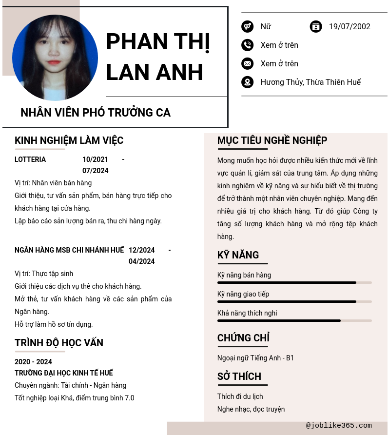 Xem hồ sơ ứng viên PHAN THỊ LAN ANH cần 2 điểm. Hồ sơ được cập nhật ngày: 06/08/2024