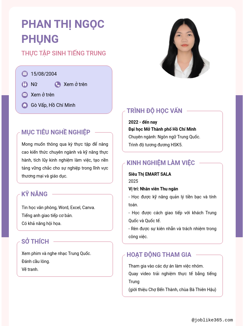 Xem hồ sơ ứng viên PHAN THỊ NGỌC PHỤNG cần 2 điểm. Hồ sơ được cập nhật ngày: 01/10/2025