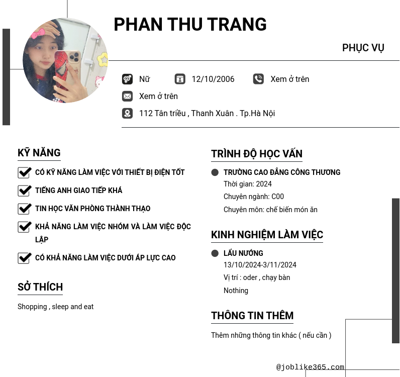Xem hồ sơ ứng viên Phan Thu Trang cần 2 điểm. Hồ sơ được cập nhật ngày: 05/11/2024