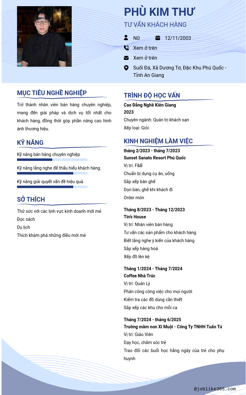 Xem hồ sơ ứng viên PHÙ KIM THƯ cần 2 điểm. Hồ sơ được cập nhật ngày: 21/08/2025