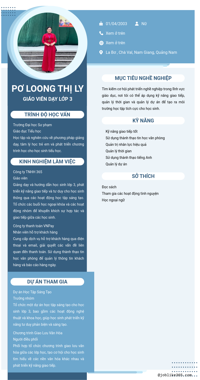 Xem hồ sơ ứng viên Pơ Loong Thị Ly cần 2 điểm. Hồ sơ được cập nhật ngày: 03/05/2025