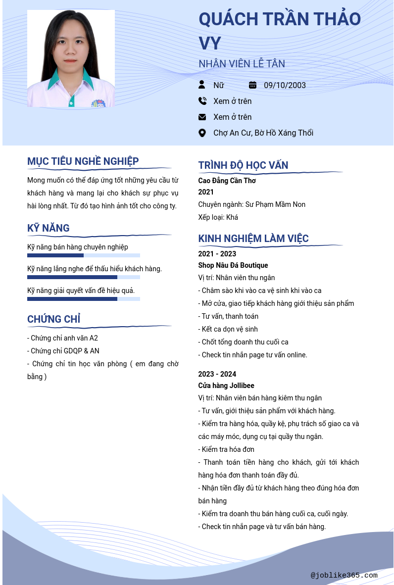 Xem hồ sơ ứng viên Quách Trần Thảo Vy cần 2 điểm. Hồ sơ được cập nhật ngày: 05/11/2024