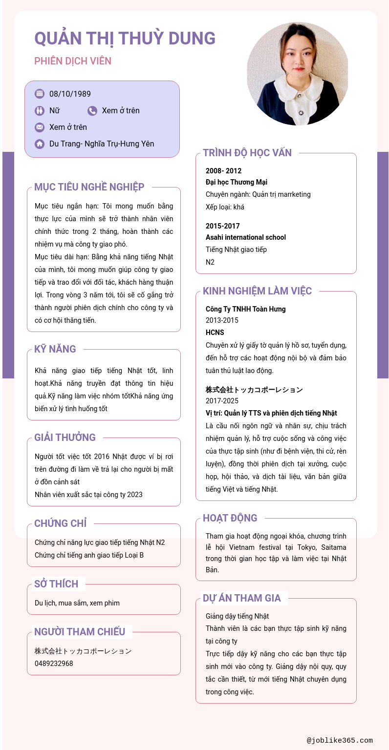 Xem hồ sơ ứng viên QUẢN THỊ THUỲ DUNG cần 2 điểm. Hồ sơ được cập nhật ngày: 30/01/2026