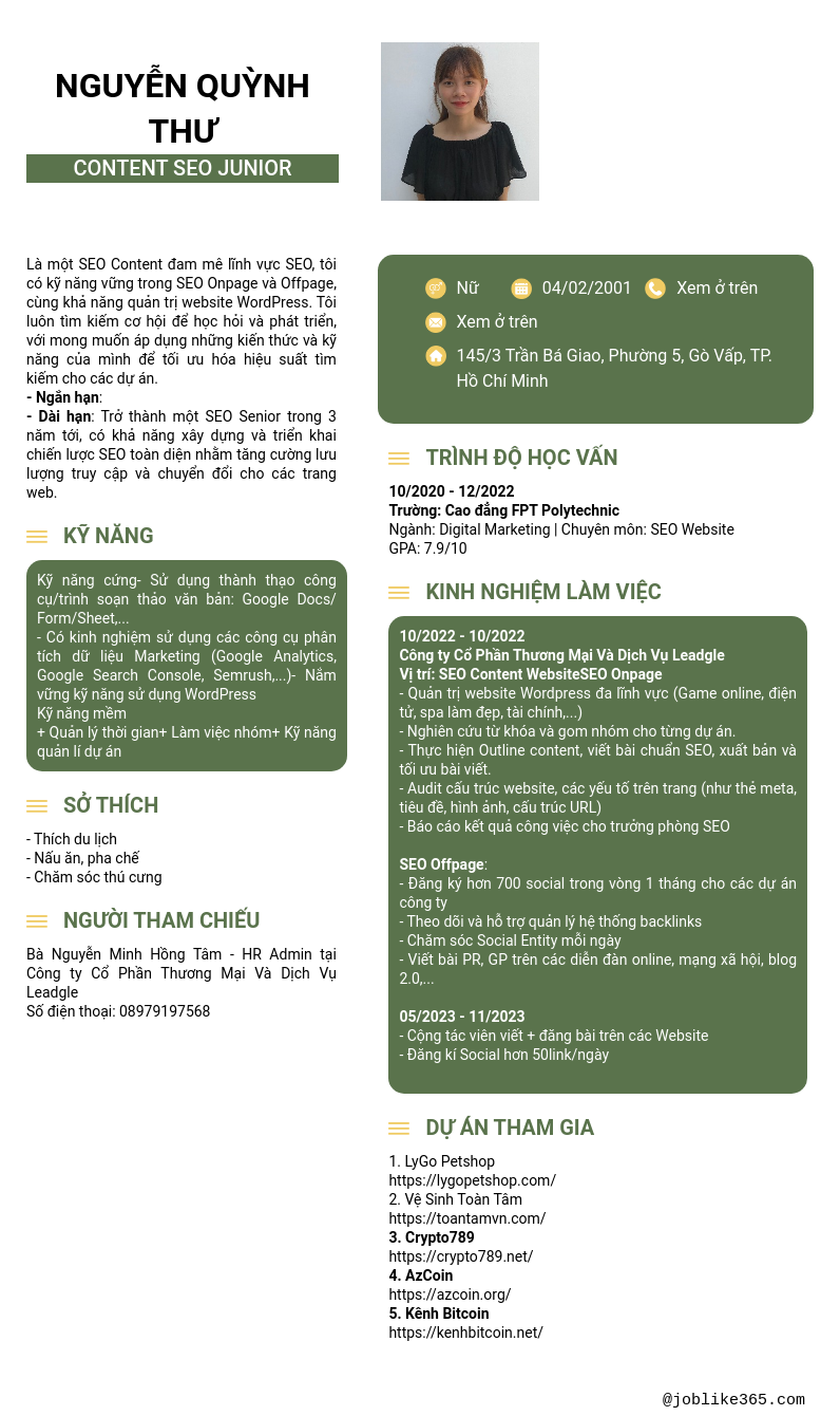 Xem hồ sơ ứng viên NGUYỄN Quỳnh Thư cần 2 điểm. Hồ sơ được cập nhật ngày: 03/11/2024