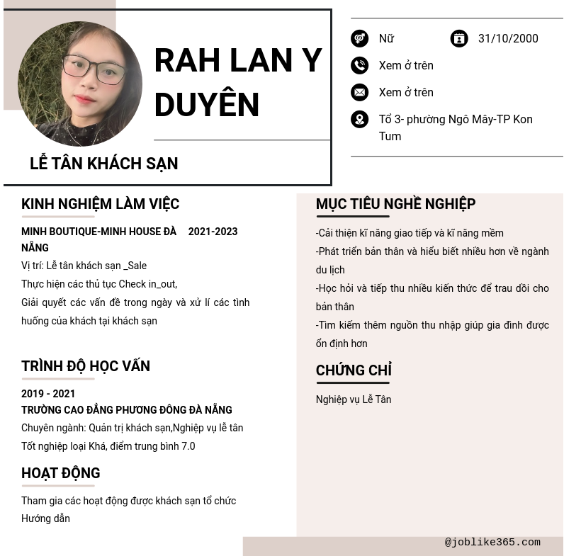 Xem hồ sơ ứng viên Rah Lan Y Duyên cần 2 điểm. Hồ sơ được cập nhật ngày: 05/02/2025