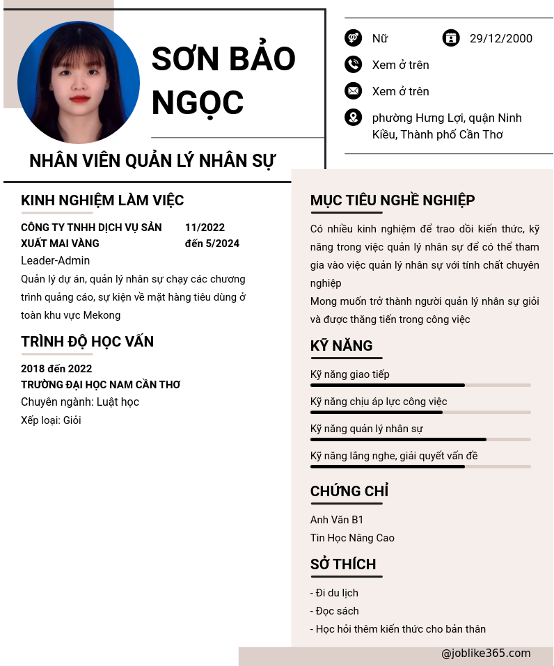 Xem hồ sơ ứng viên SƠN BẢO NGỌC cần 2 điểm. Hồ sơ được cập nhật ngày: 27/05/2024