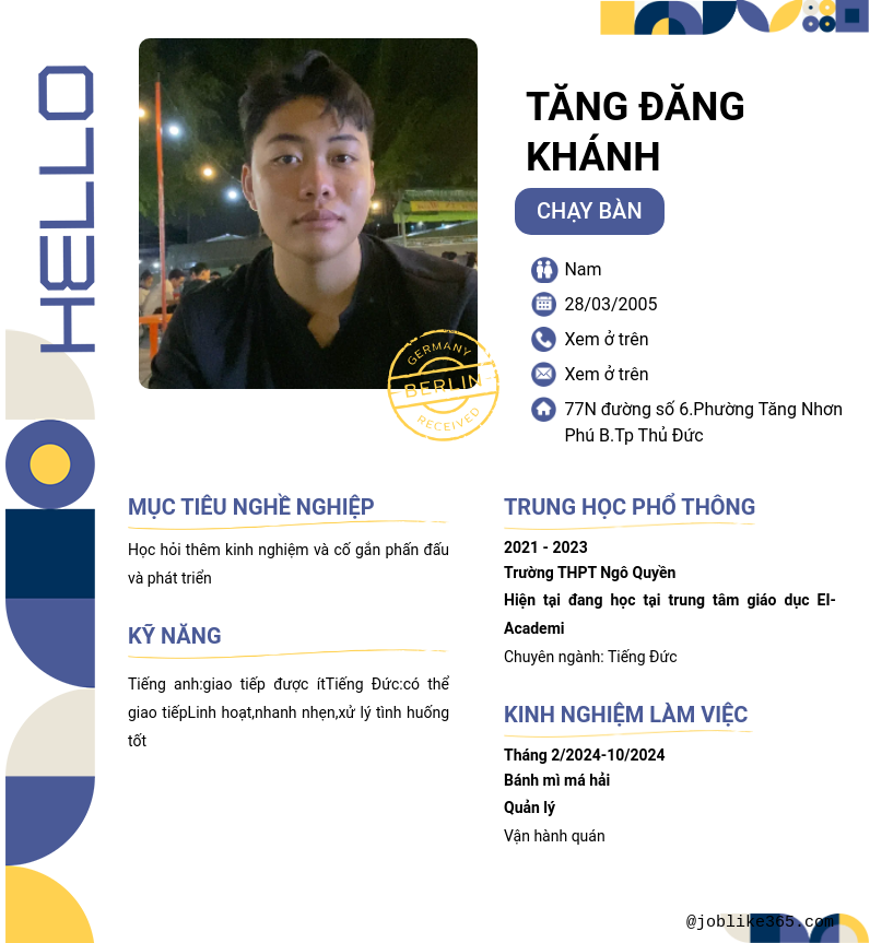 Xem hồ sơ ứng viên TĂNG ĐĂNG KHÁNH cần 2 điểm. Hồ sơ được cập nhật ngày: 01/11/2024