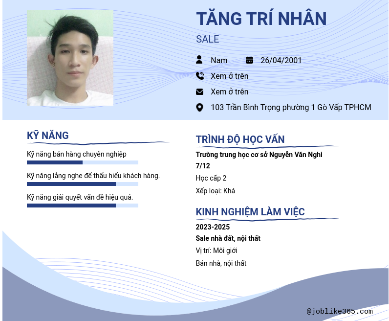 Xem hồ sơ ứng viên Tăng Trí Nhân cần 2 điểm. Hồ sơ được cập nhật ngày: 10/06/2025