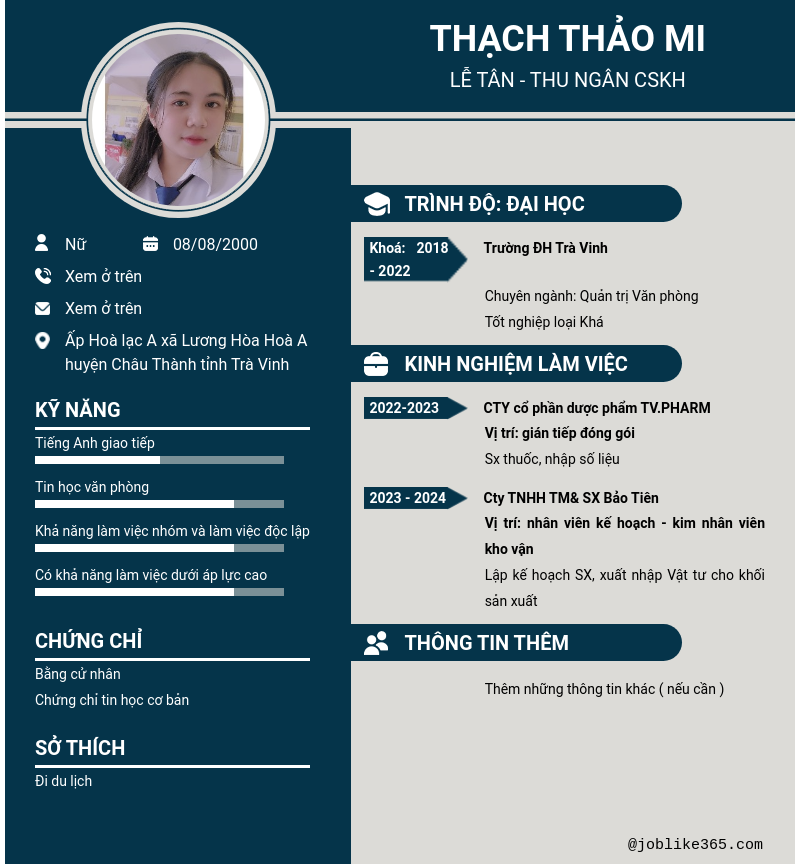 Xem hồ sơ ứng viên Thạch Thảo Mi cần 2 điểm. Hồ sơ được cập nhật ngày: 04/02/2025