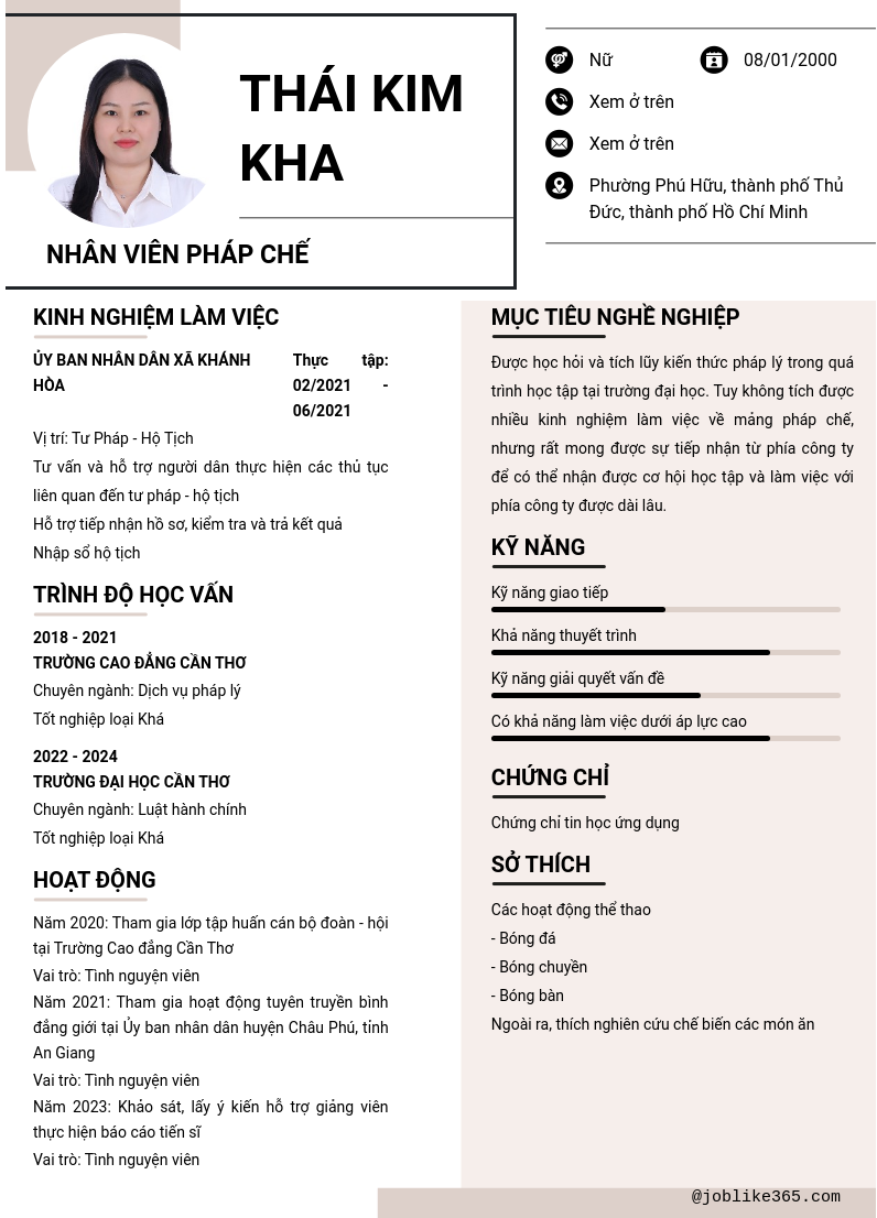 Xem hồ sơ ứng viên THÁI KIM KHA cần 2 điểm. Hồ sơ được cập nhật ngày: 13/11/2024