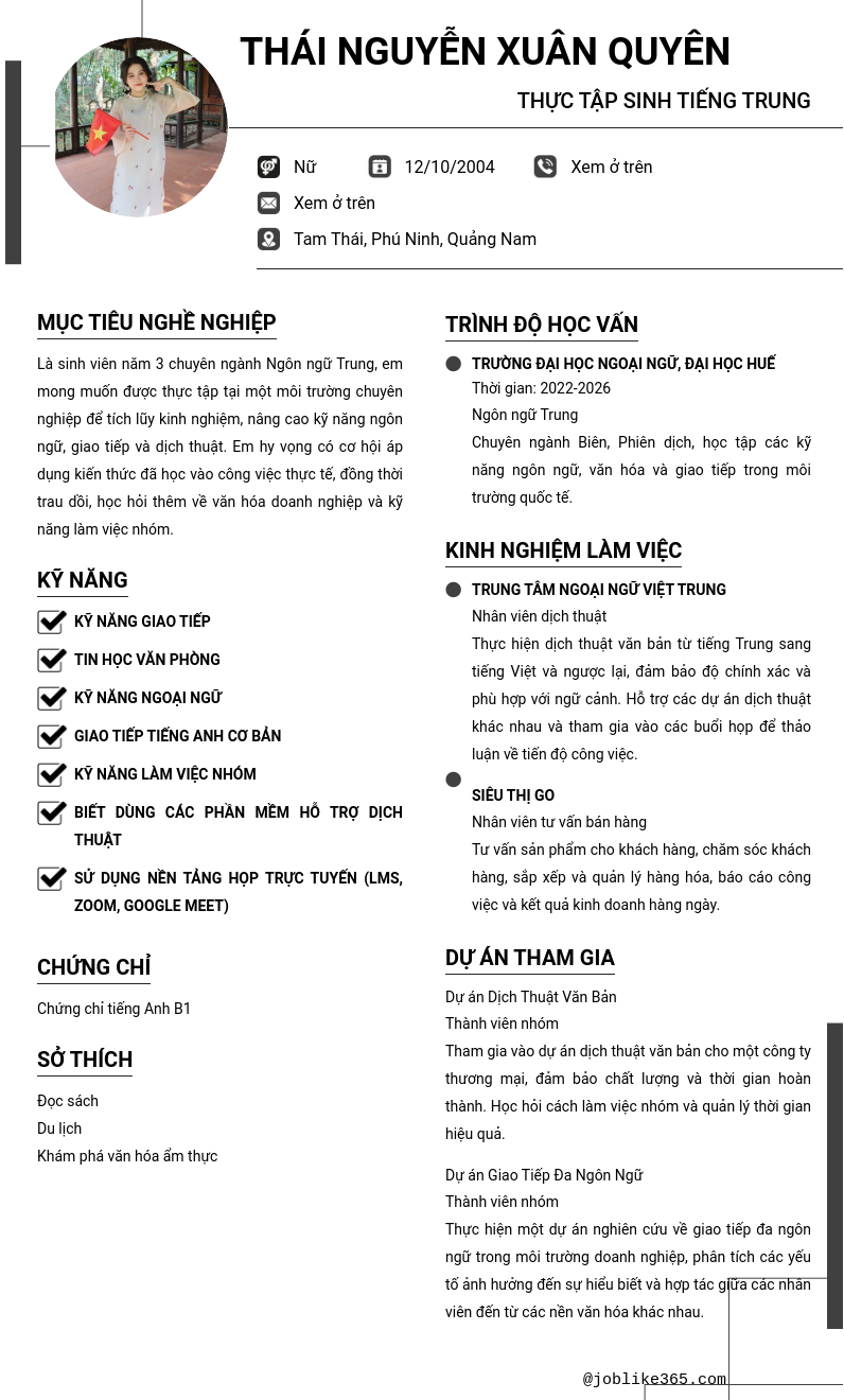 Xem hồ sơ ứng viên THÁI NGUYỄN XUÂN QUYÊN cần 2 điểm. Hồ sơ được cập nhật ngày: 21/05/2025