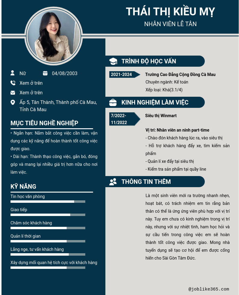 Xem hồ sơ ứng viên THÁI THỊ KIỀU MỴ cần 2 điểm. Hồ sơ được cập nhật ngày: 17/10/2024
