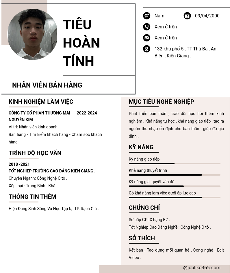 Xem hồ sơ ứng viên Tiêu Hoàn Tính cần 2 điểm. Hồ sơ được cập nhật ngày: 03/07/2024
