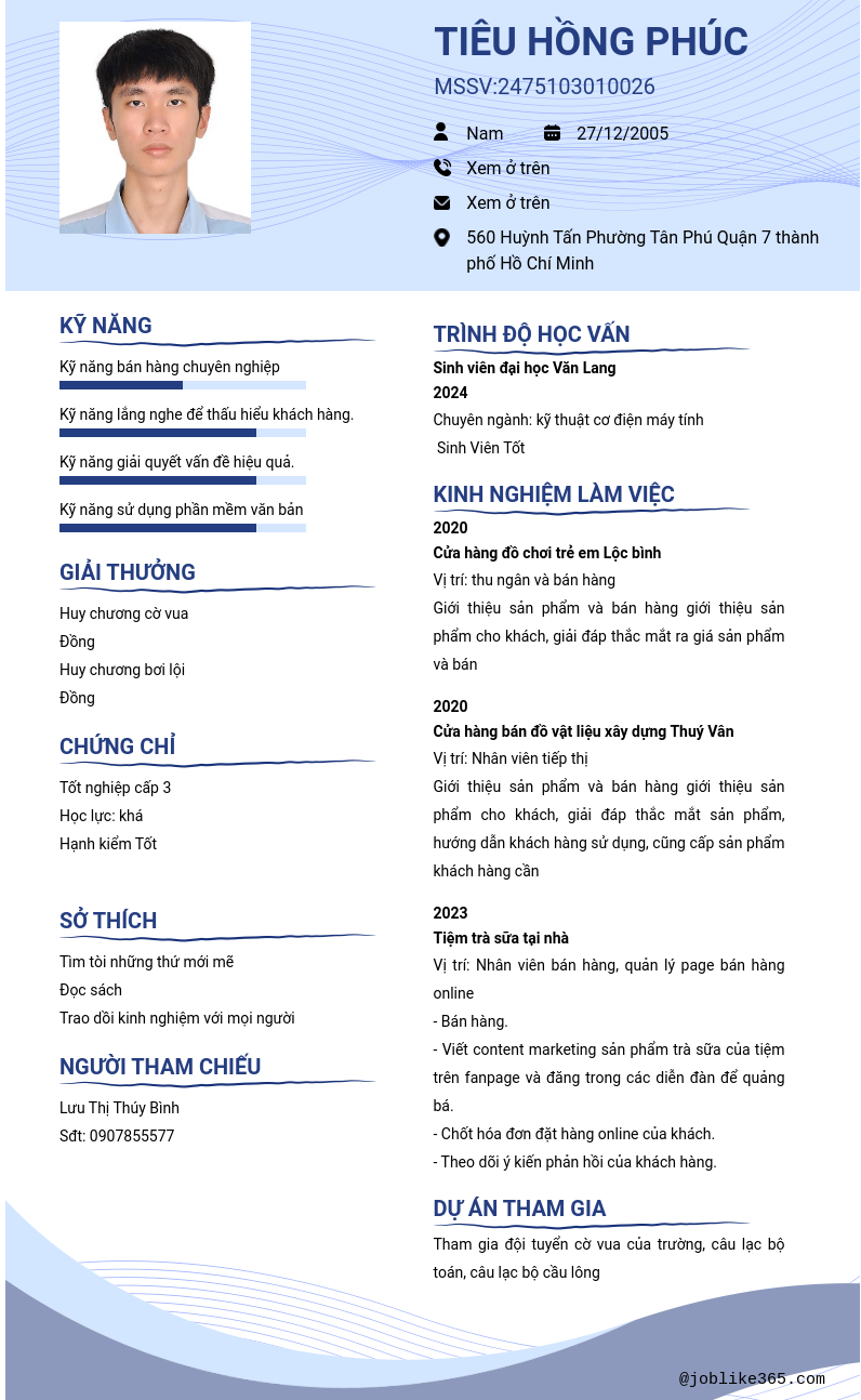 Xem hồ sơ ứng viên Tiêu HỒNG PHÚC cần 2 điểm. Hồ sơ được cập nhật ngày: 27/11/2024