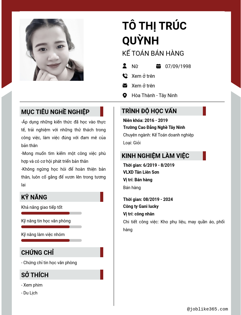 Xem hồ sơ ứng viên TÔ THỊ TRÚC QUỲNH cần 2 điểm. Hồ sơ được cập nhật ngày: 27/02/2025