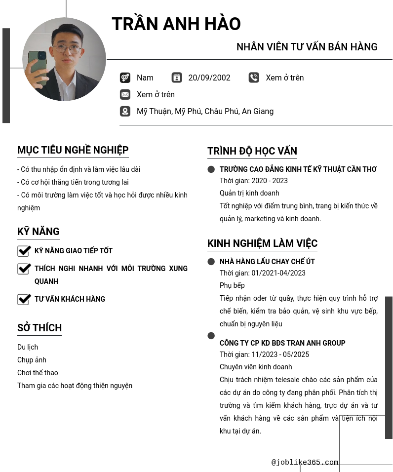 Xem hồ sơ ứng viên TRẦN ANH HÀO cần 2 điểm. Hồ sơ được cập nhật ngày: 26/10/2025