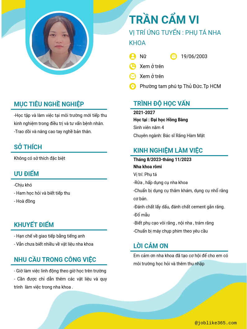 Xem hồ sơ ứng viên TRẦN CẨM VI cần 2 điểm. Hồ sơ được cập nhật ngày: 20/09/2024