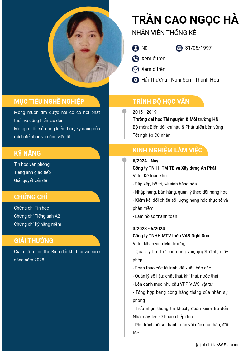 Xem hồ sơ ứng viên trần cao ngọc hà cần 2 điểm. Hồ sơ được cập nhật ngày: 28/07/2025