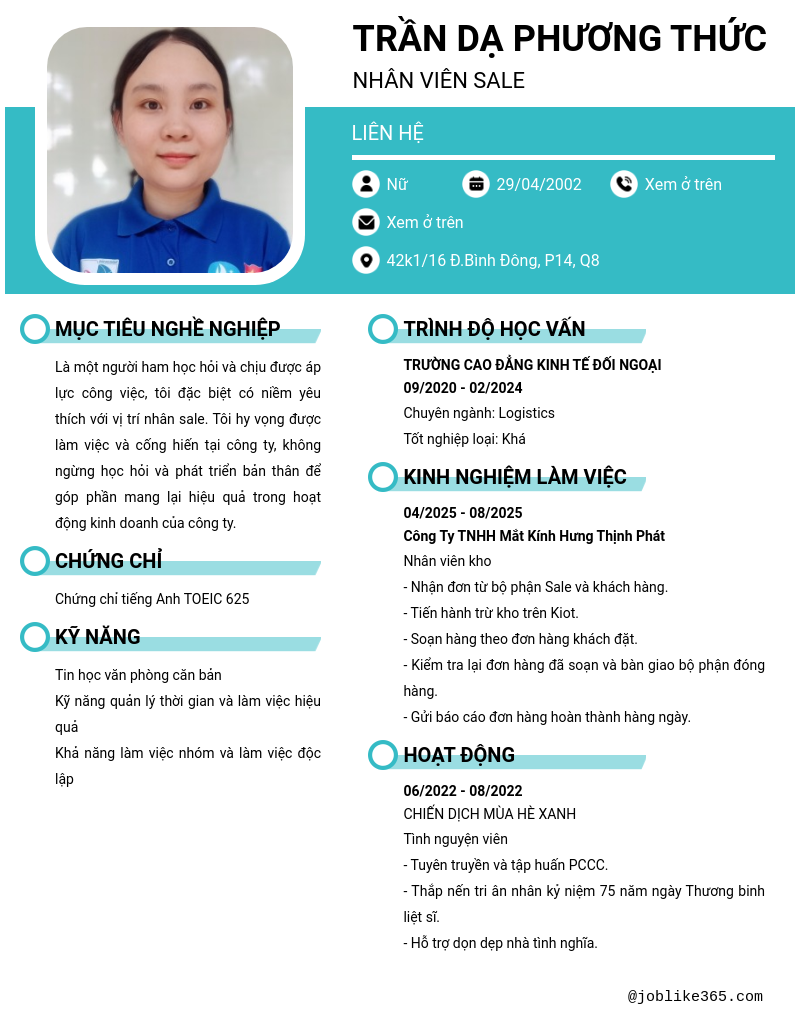 Xem hồ sơ ứng viên TRẦN DẠ PHƯƠNG THỨC cần 2 điểm. Hồ sơ được cập nhật ngày: 17/01/2026