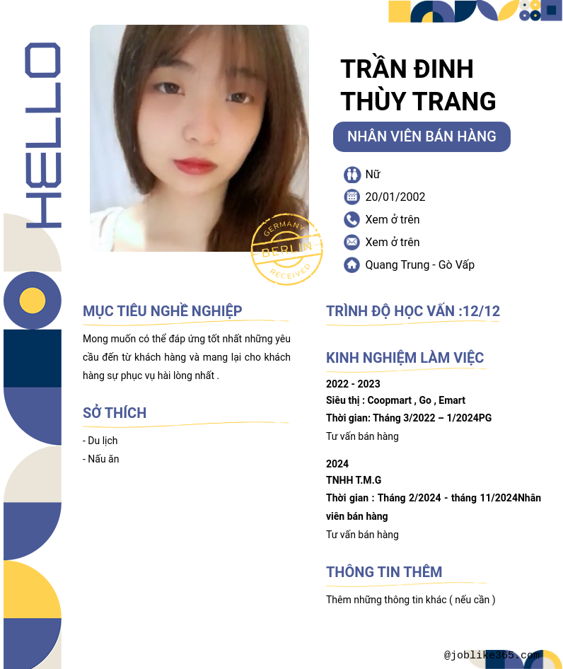 Xem hồ sơ ứng viên Trần Đinh Thùy Trang cần 2 điểm. Hồ sơ được cập nhật ngày: 06/12/2024