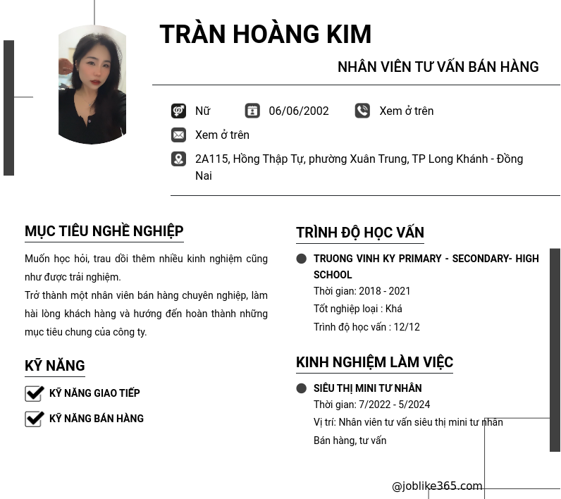Xem hồ sơ ứng viên TRÀN HOÀNG KIM cần 2 điểm. Hồ sơ được cập nhật ngày: 07/06/2024