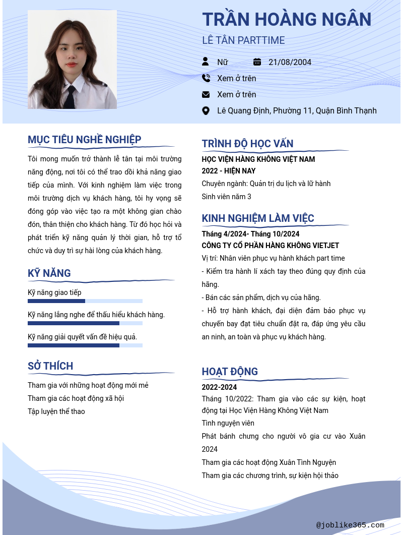 Xem hồ sơ ứng viên TRẦN HOÀNG NGÂN cần 2 điểm. Hồ sơ được cập nhật ngày: 03/10/2024