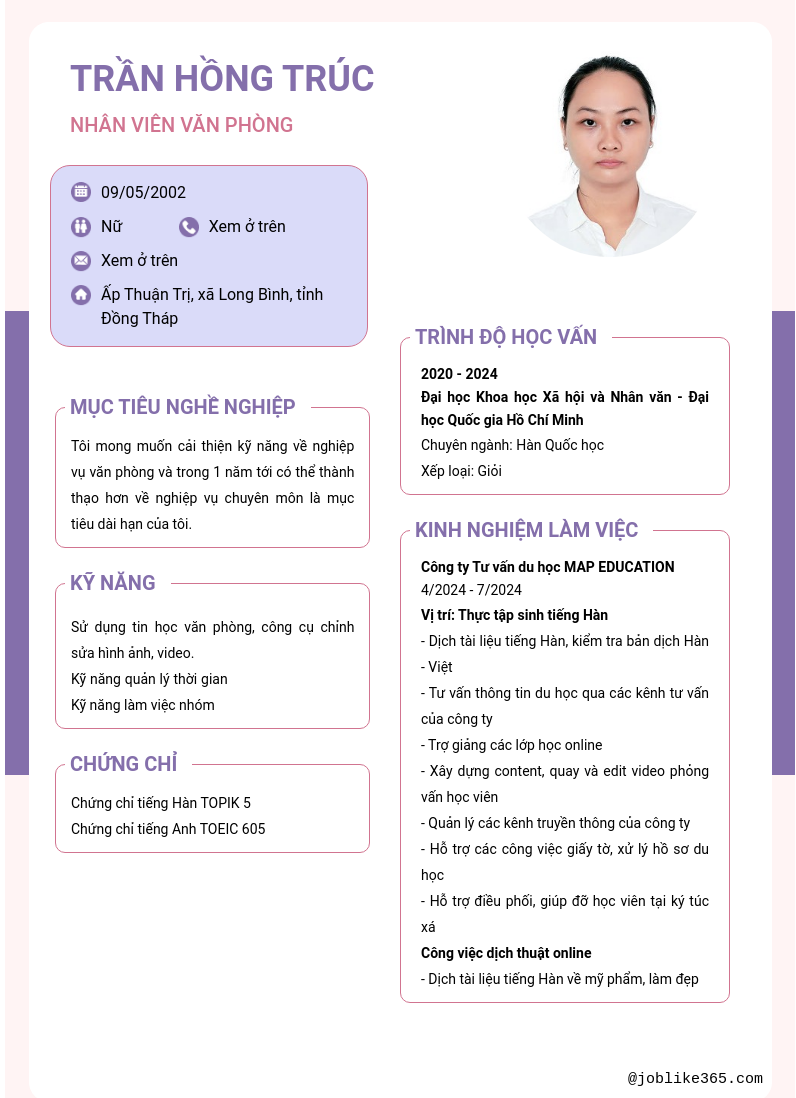 Xem hồ sơ ứng viên Trần hồng trúc cần 2 điểm. Hồ sơ được cập nhật ngày: 23/08/2025