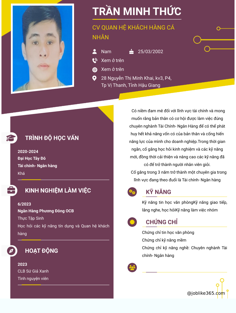 Xem hồ sơ ứng viên TRẦN MINH THỨC cần 2 điểm. Hồ sơ được cập nhật ngày: 03/06/2024