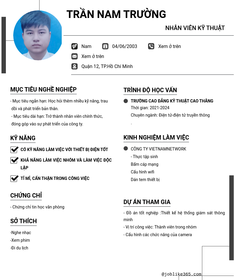 Xem hồ sơ ứng viên Trần Nam Trường cần 2 điểm. Hồ sơ được cập nhật ngày: 01/12/2024