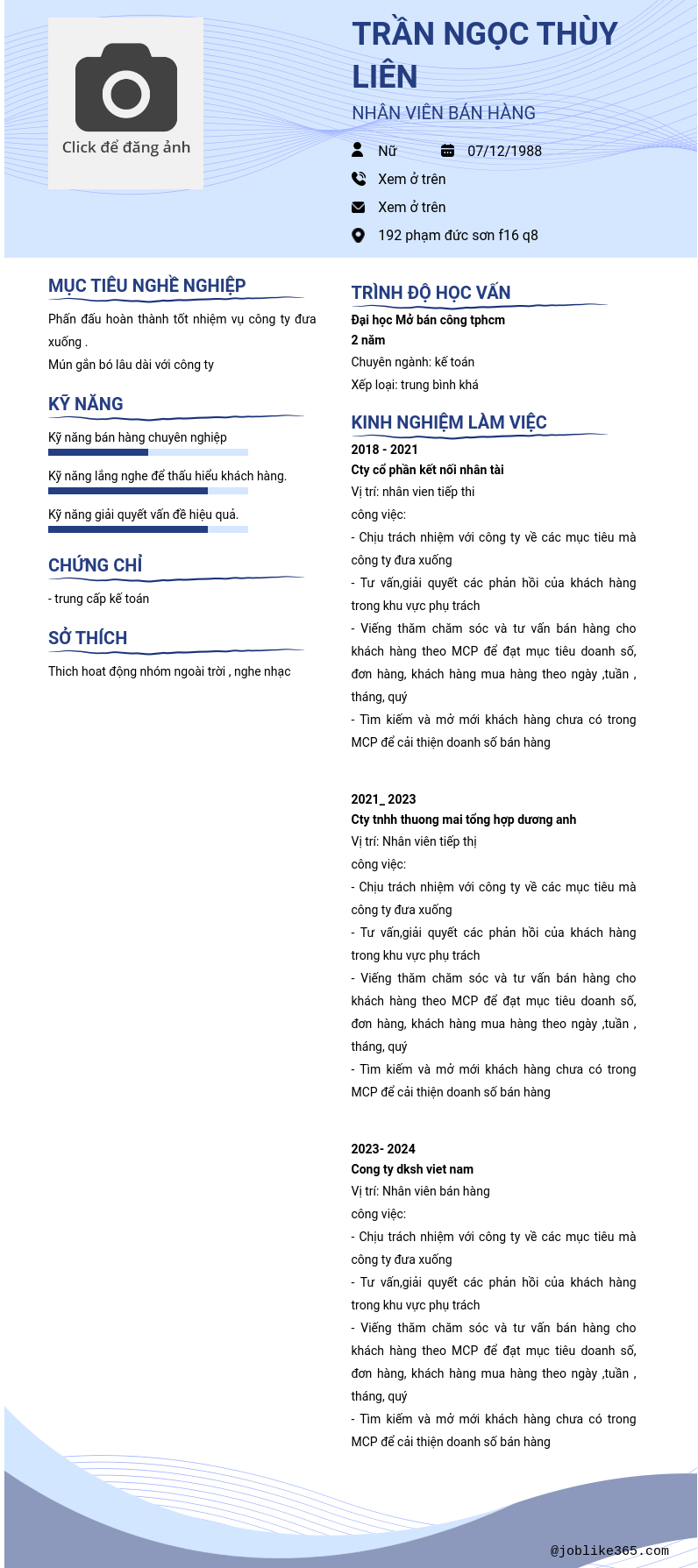 Xem hồ sơ ứng viên Trần ngọc thùy liên cần 2 điểm. Hồ sơ được cập nhật ngày: 31/10/2024