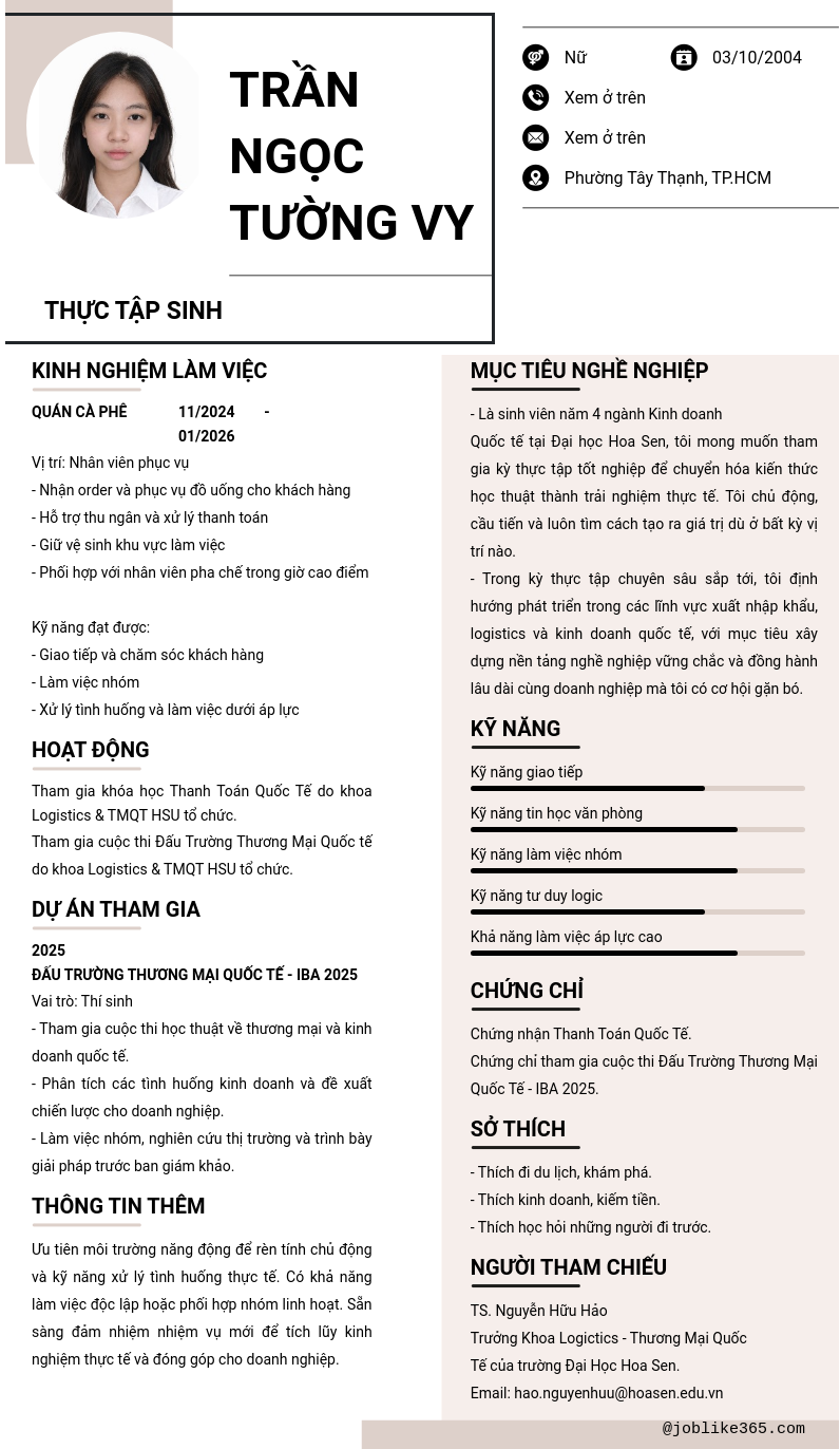 Xem hồ sơ ứng viên TRẦN NGỌC TƯỜNG VY cần 2 điểm. Hồ sơ được cập nhật ngày: 04/03/2026