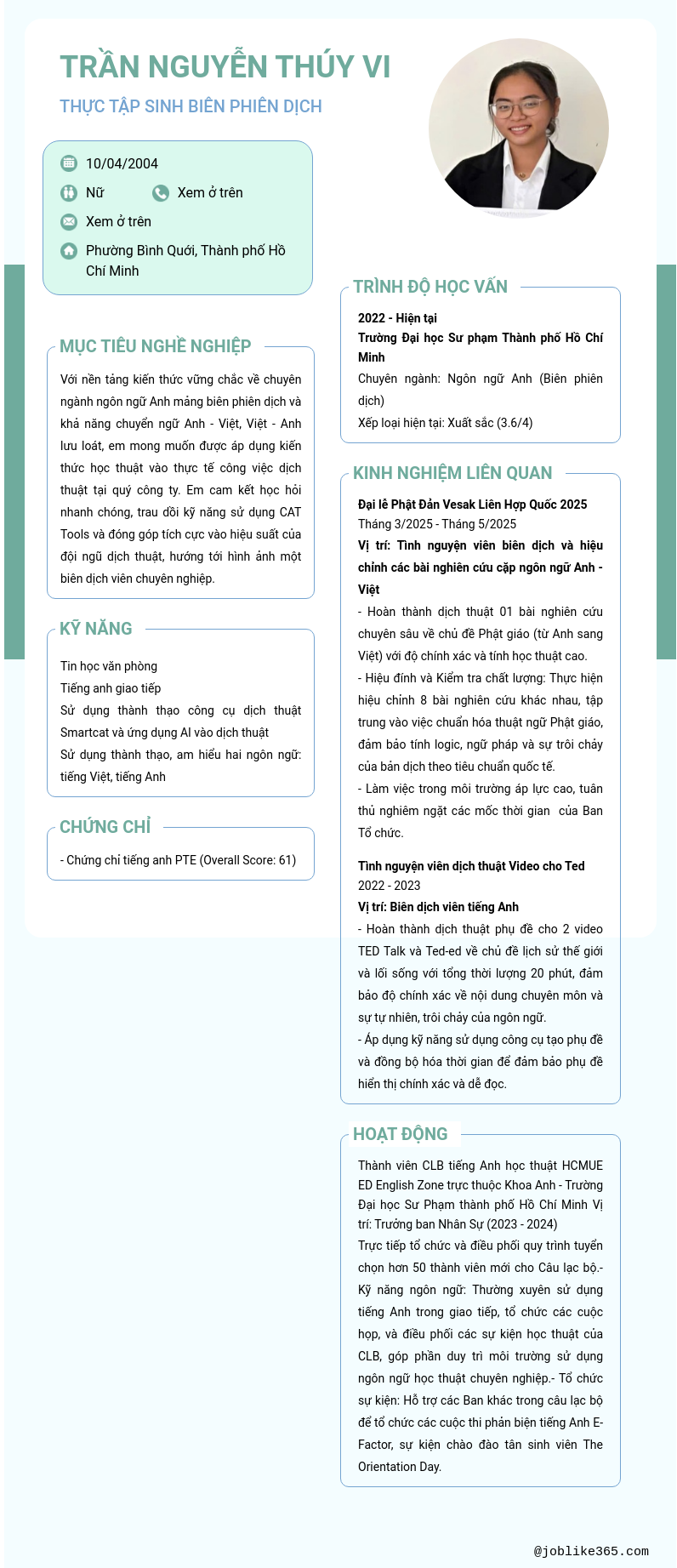 Xem hồ sơ ứng viên TRẦN NGUYỄN THÚY VI cần 2 điểm. Hồ sơ được cập nhật ngày: 14/10/2025