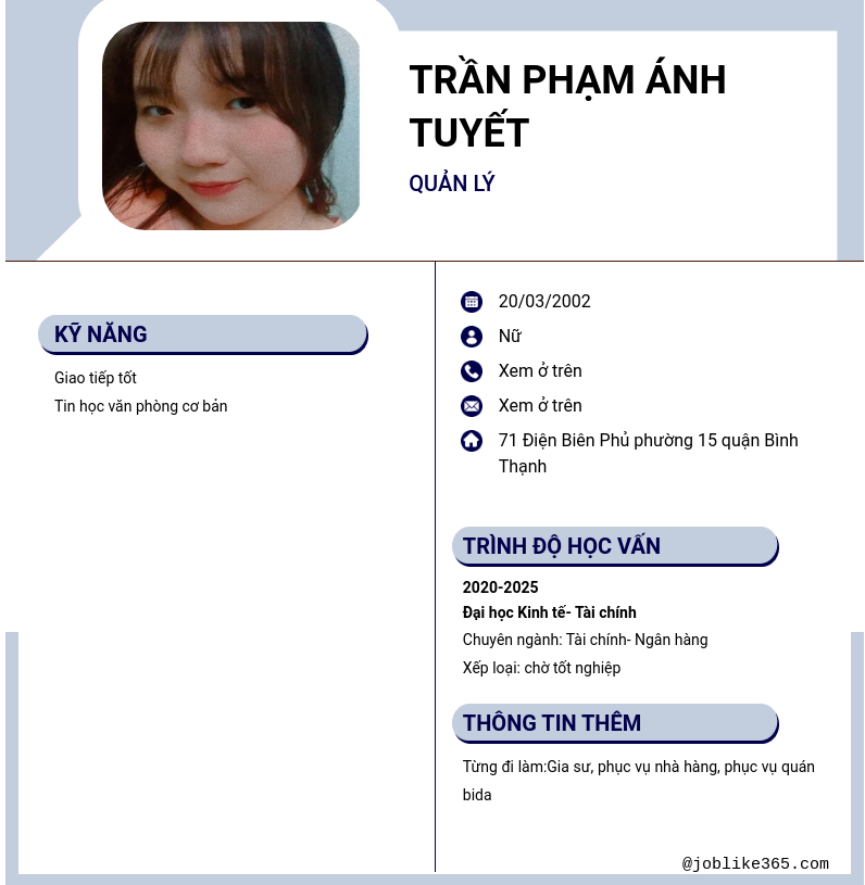 Xem hồ sơ ứng viên Trần Phạm Ánh Tuyết cần 2 điểm. Hồ sơ được cập nhật ngày: 01/11/2024
