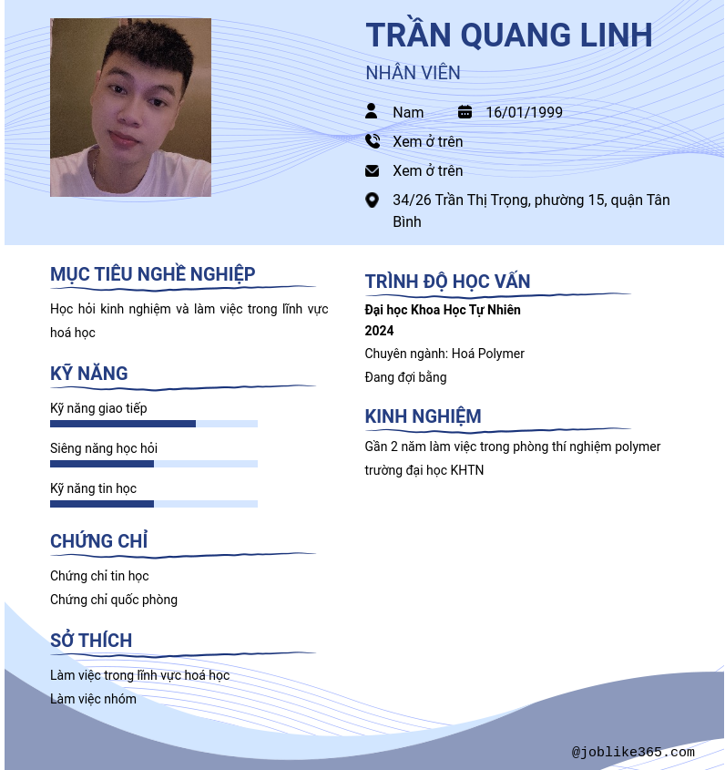 Xem hồ sơ ứng viên Trần Quang Linh cần 2 điểm. Hồ sơ được cập nhật ngày: 07/11/2024