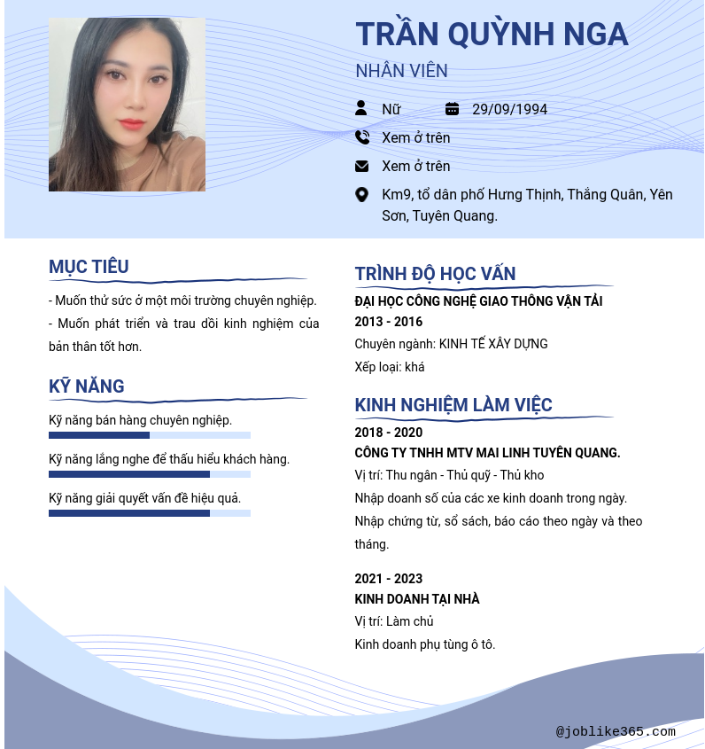 Xem hồ sơ ứng viên Trần Quỳnh Nga cần 2 điểm. Hồ sơ được cập nhật ngày: 04/12/2024
